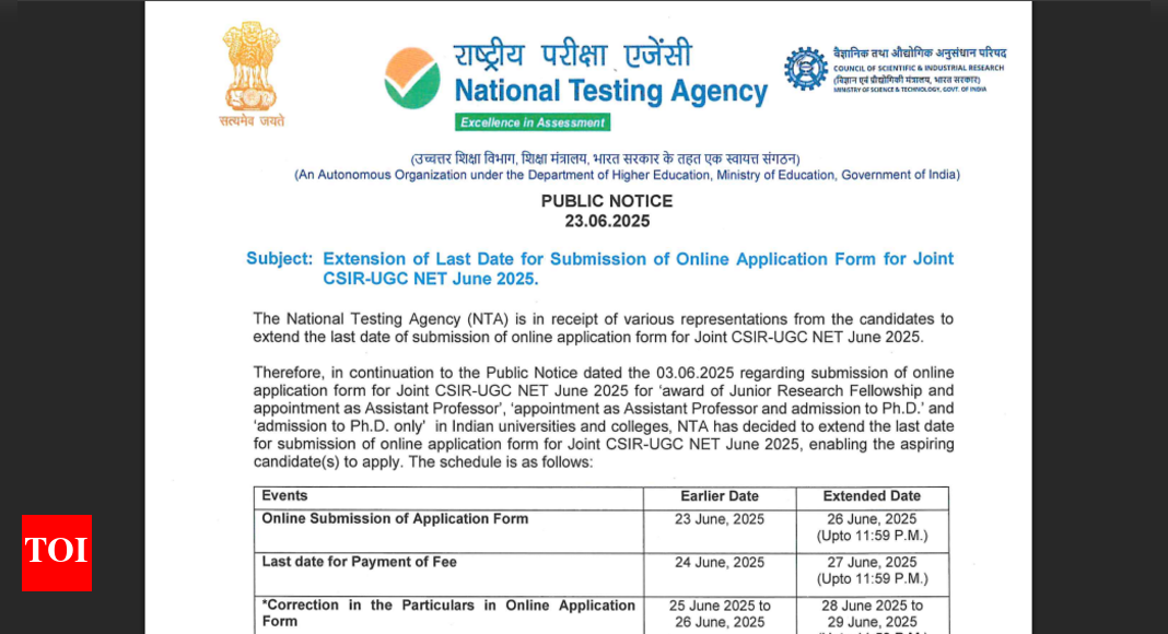 The National Testing Agency (NTA) has extended the registration deadline for the CSIR UGC NET June 2025 examination to June…