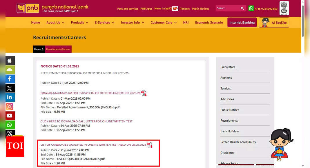 PNB Bank SO Recruitment 2025: Result of online exam declared at pnbindia.in; 1836 candidates selected; download result PDF here without…