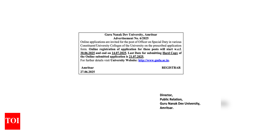 Guru Nanak Dev University (GNDU), Amritsar has released a notification inviting applications for the position of Officer on Special Duty…