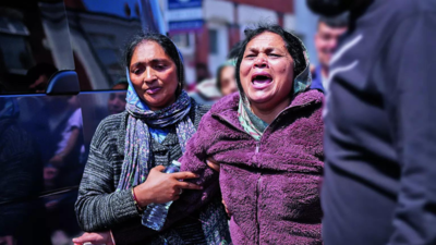 Viswashkumar Ramesh’s mother (R) mourns for her other son Ajay, who was on the same flight, in Leicester on Friday…