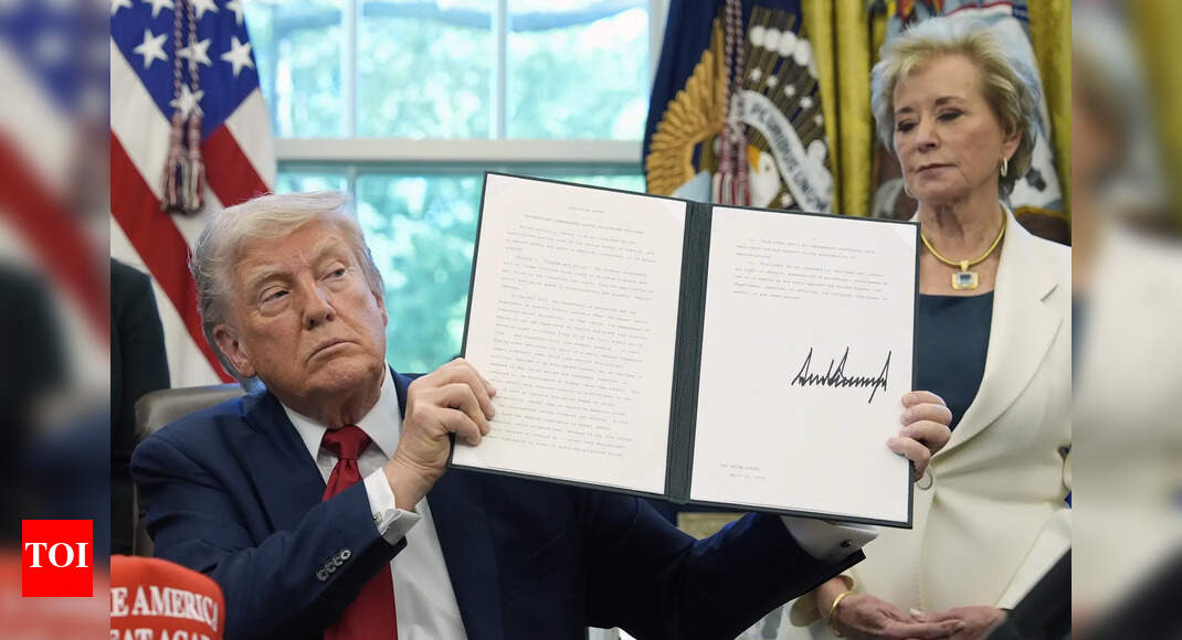 FILE – President Donald Trump holds a signed an executive order relating to school discipline policies as Education Secretary Linda…