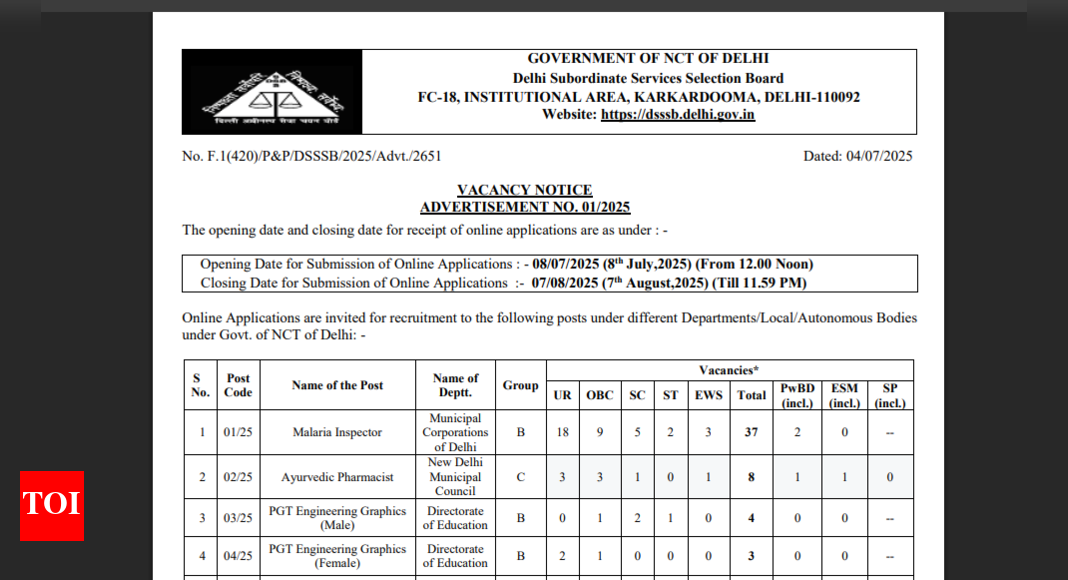 DSSSB recruitment 2025: The Delhi Subordinate Services Selection Board (DSSSB) has officially released Advertisement No. 01/2025 inviting online applications for…